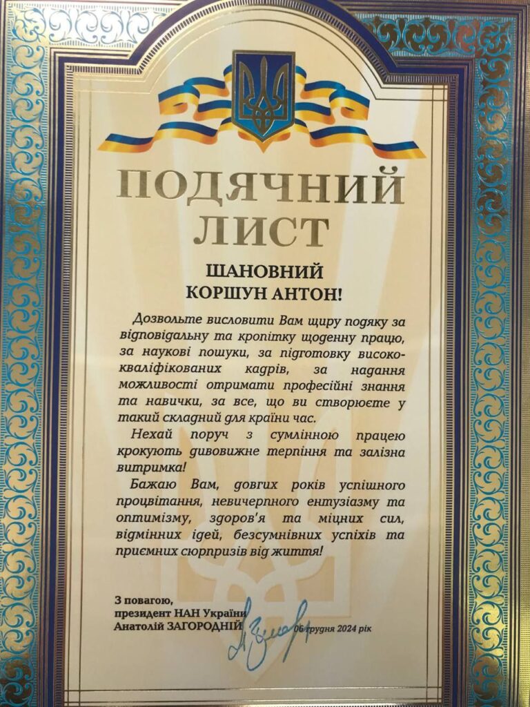 Це визнання є яскравим підтвердженням його плідної праці, спрямованої на розвиток наукового підґрунтя експертної діяльності, вдосконалення її стандартів та впровадження нових ідей. Робота Антона Володимировича є не лише важливою складовою системи правосуддя, а й прикладом глибокої відданості професії. Він активно розробляє нові методики дослідження документів, підвищуючи ефективність та об’єктивність експертних висновків. Його підхід базується на науковій аргументації, практичному досвіді та прагненні до вдосконалення всієї експертної системи.