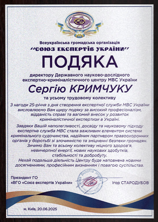 ✨ Під час урочистої частини Ігор Стародубов вручив подяку ВГО «Союз експертів України» директору ДНДЕКЦ МВС України Сергію Кримчуку та всьому трудовому колективу Служби. У подяці — щира вдячність за професіоналізм, системну наукову роботу, стратегічне бачення та відданість справі, яка зміцнює українську експертну галузь.