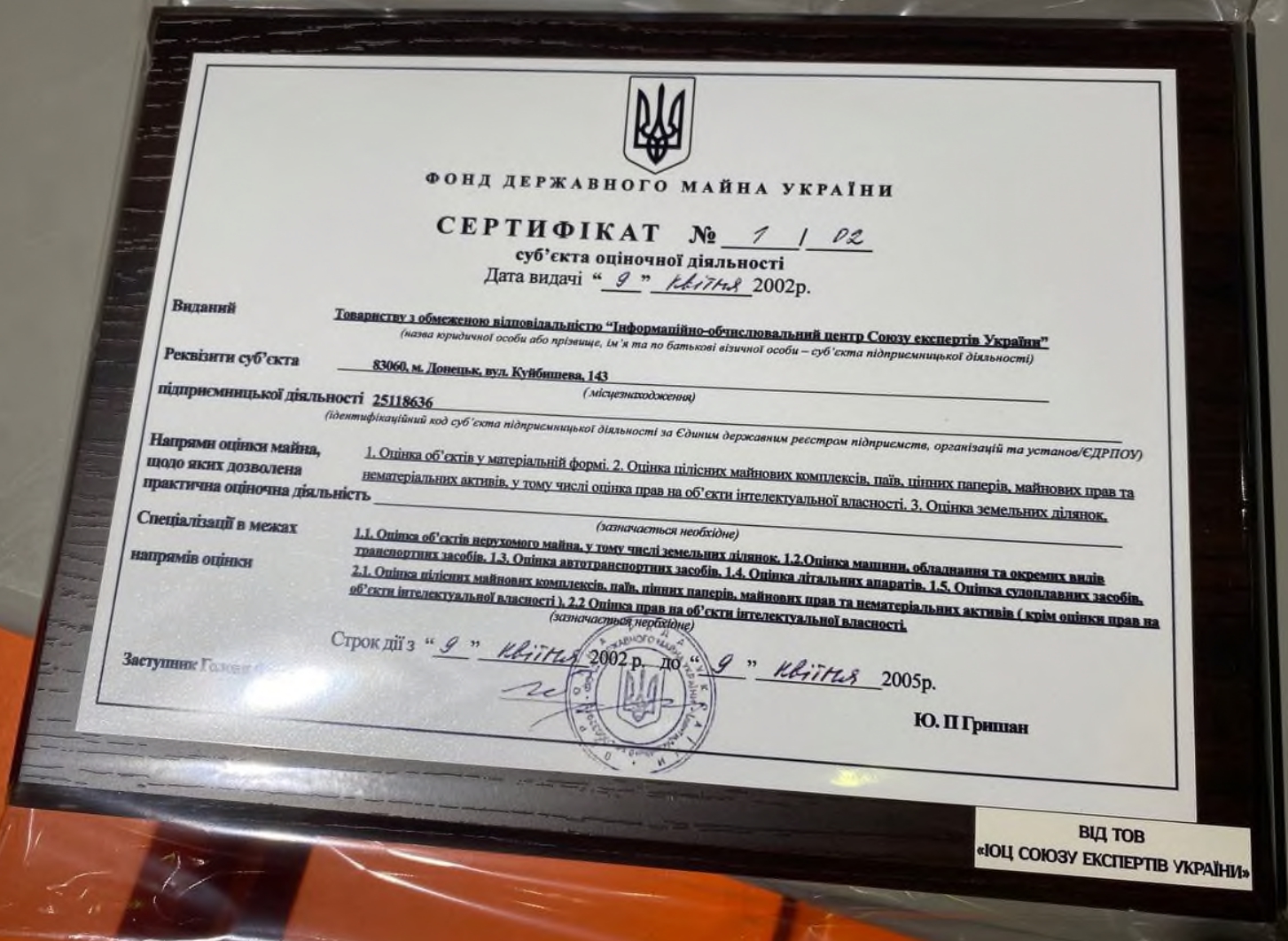 Крім цього, директор ТОВ «Інформаційно-обчислювальний центр Союзу експертів України» Стародубов Вадим Володимирович передав до музею ФДМУ перший сертифікат суб’єкта оціночної діяльності, виданий в Україні під № 1, у 2002 році.