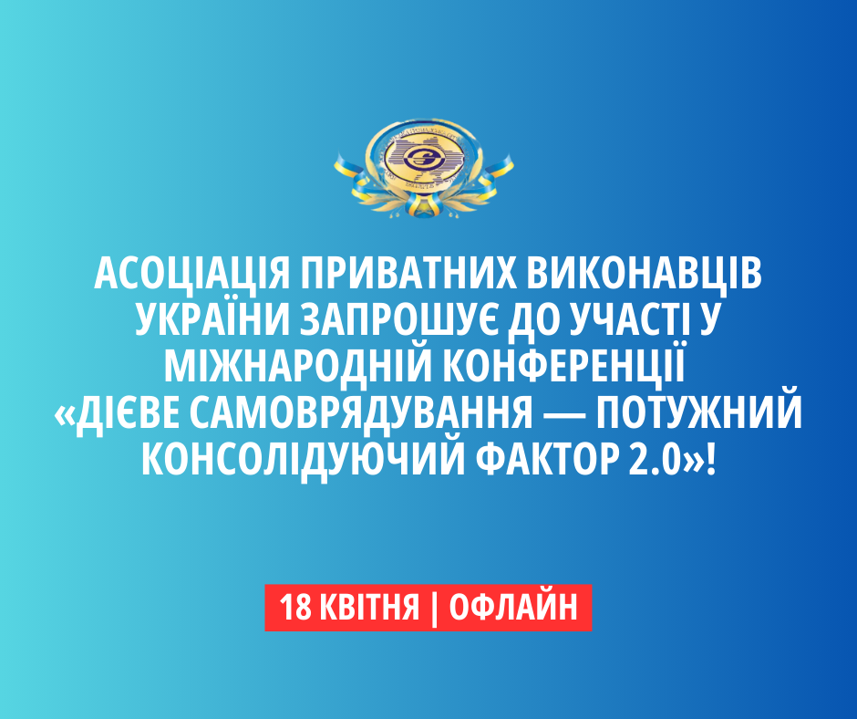 Шановні члени ГО «ВГО «Союз експертів України»! Асоціація приватних виконавців України запрошує до участі у міжнародній конференції «Дієве самоврядування — потужний консолідуючий фактор 2.0»! 💼